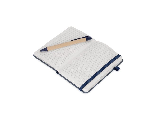 Caderneta ecológica de capa dura revestida em fibra de palha de trigo. Contém aproximadamente 80 folhas brancas com pauta, além de duas folhas de guarda, uma fita para fechamento e porta-canetas elástico. Acompanha uma caneta esferográfica de carga azul de 1,0mm com corpo em papelão e clip, acionamento por clique e ponteira em plástico.