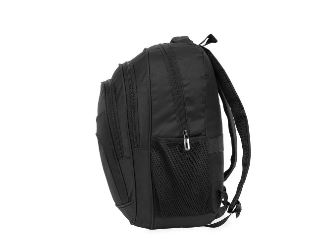 Mochila confeccionada em nylon impermeável com capacidade máxima de 25L. Possui compartimento principal com divisória para notebooks de até 15,6 polegadas. Conta com dois compartimentos externos em tamanhos diferentes, além de dois bolsos laterais em malha com elástico e engate para malas. Dispõe também de alça superior de mão e duas alças para as costas com revestimento em tecido acolchoado. Acompanha plaquinha metálica personalizável.