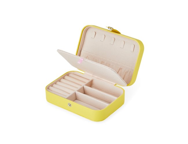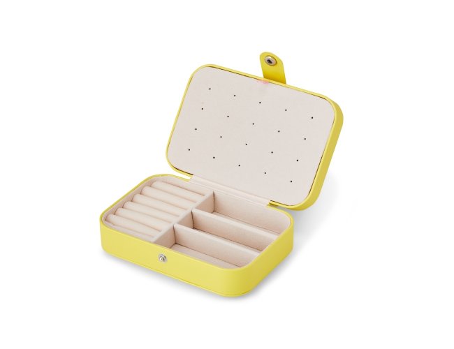 Porta-joias de couro sintético com revestimento aveludado. Possui compartimentos internos para anéis, pulseiras, colares e placa para brincos.